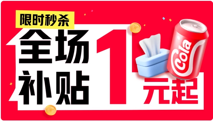 1元限时秒杀活动,全场补贴,1元发货